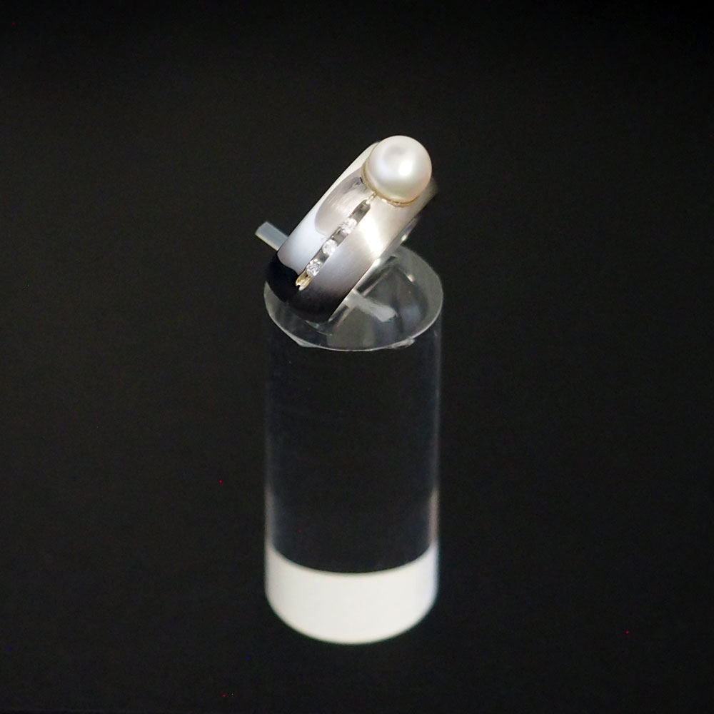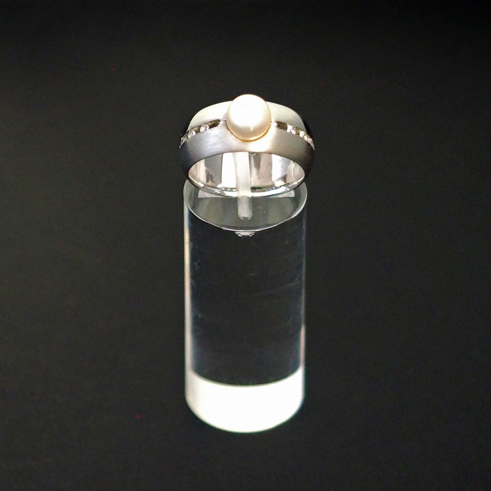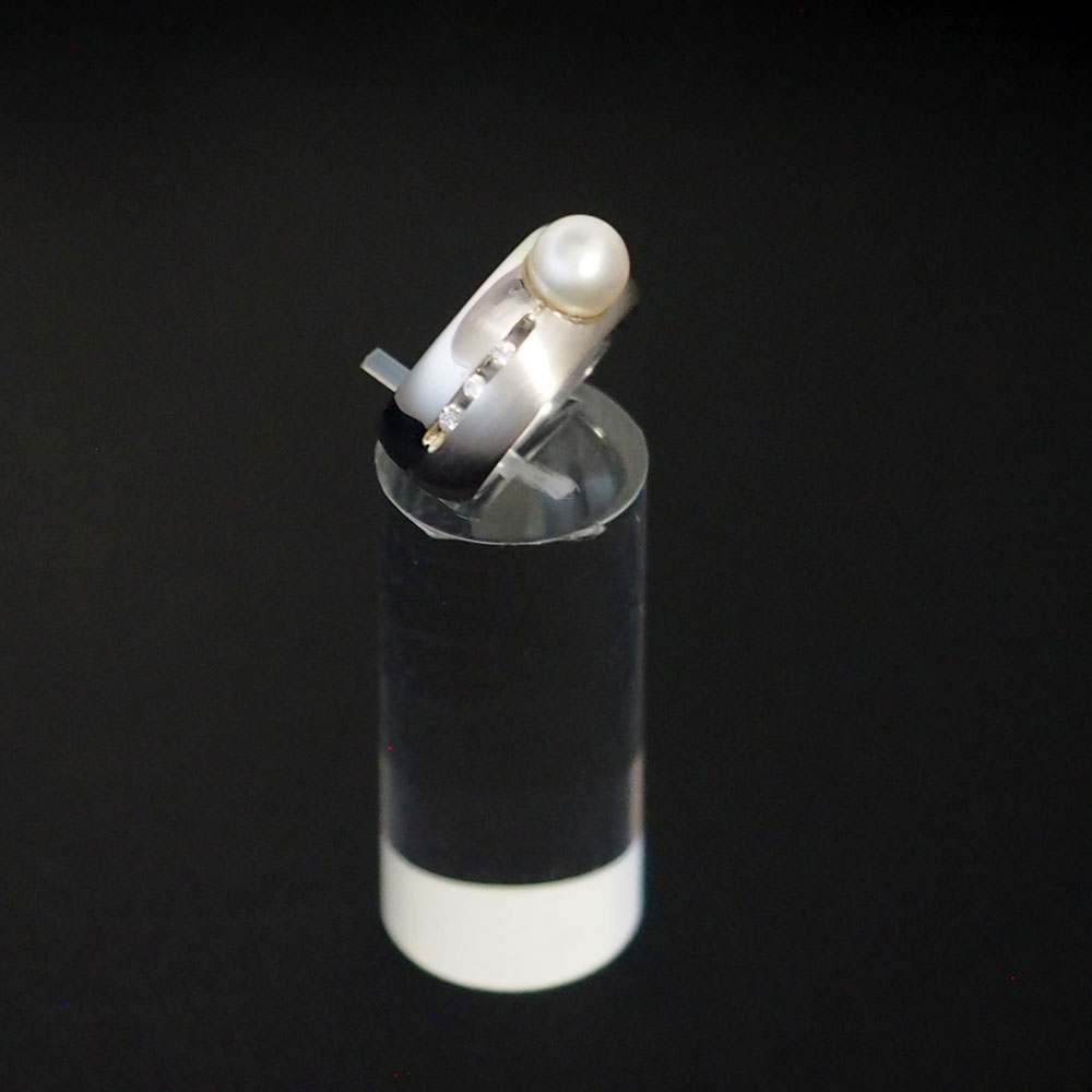 Ring in deutscher Goldschmiede hergestellt aus 925 Sterlingsilber mit einer Süßwasser-Zuchtperle und 6 Brillanten mit einem Gesamtgewicht von 0,09 Karat – der Ring hat eine polierte und eine mattierte Hälfte, auf deren Mittelline die Edelsteine sind