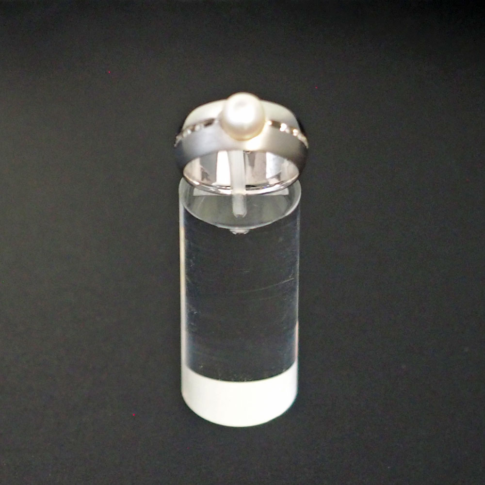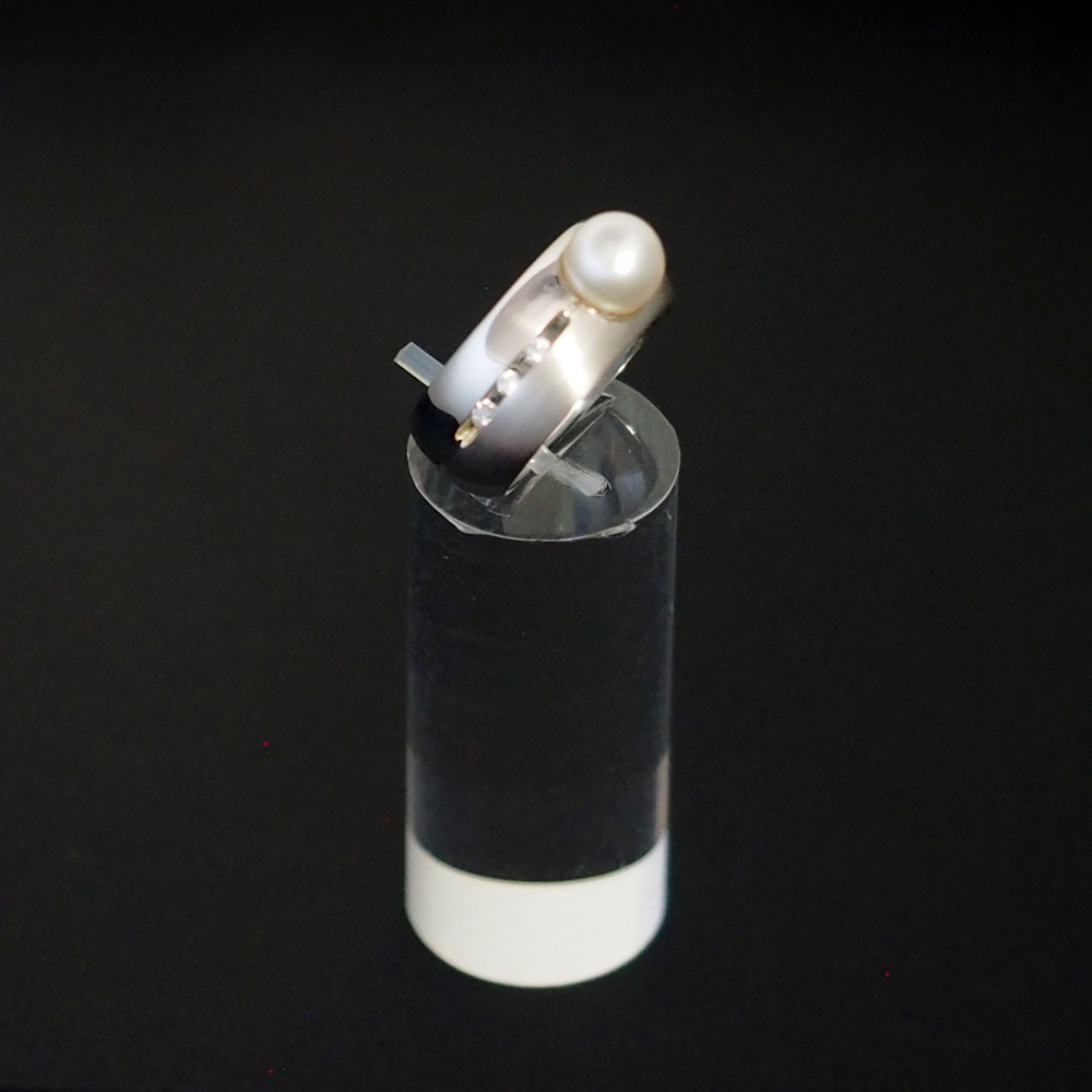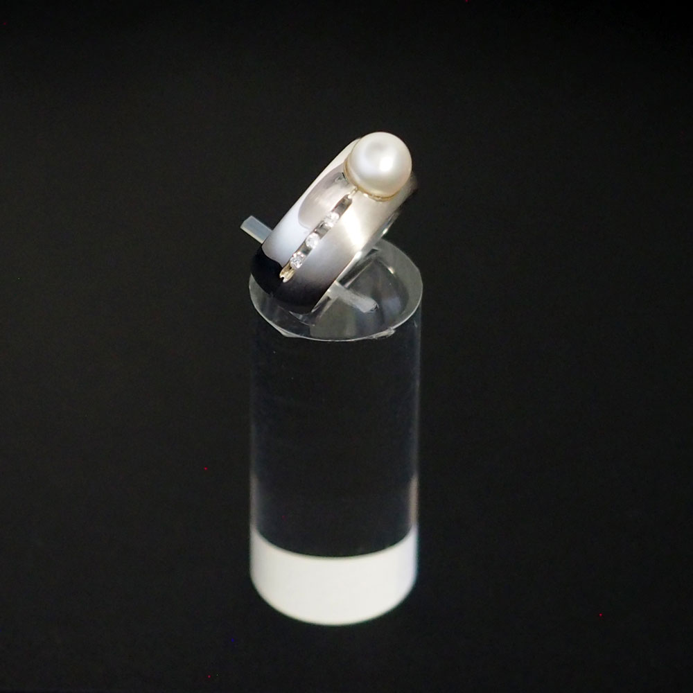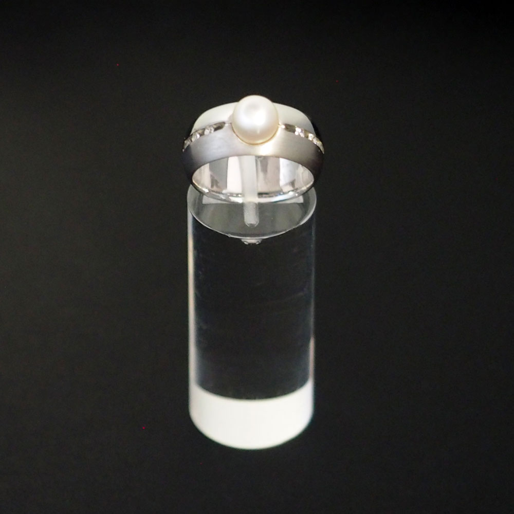 Ring in deutscher Goldschmiede hergestellt aus 925 Sterlingsilber mit einer Süßwasser-Zuchtperle und 6 Brillanten mit einem Gesamtgewicht von 0,09 Karat – der Ring hat eine polierte und eine mattierte Hälfte, auf deren Mittelline die Edelsteine sind